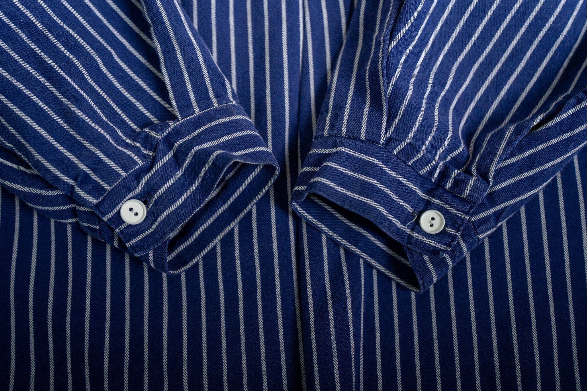 ネイビーブルーのベースにホワイトストライプが特徴となり、基本的にはプルオーバータイプで肩幅、身幅のゆったりとしたワイドシルエット。品のあるバンドカラーで個性的な雰囲気を醸し出しています。
