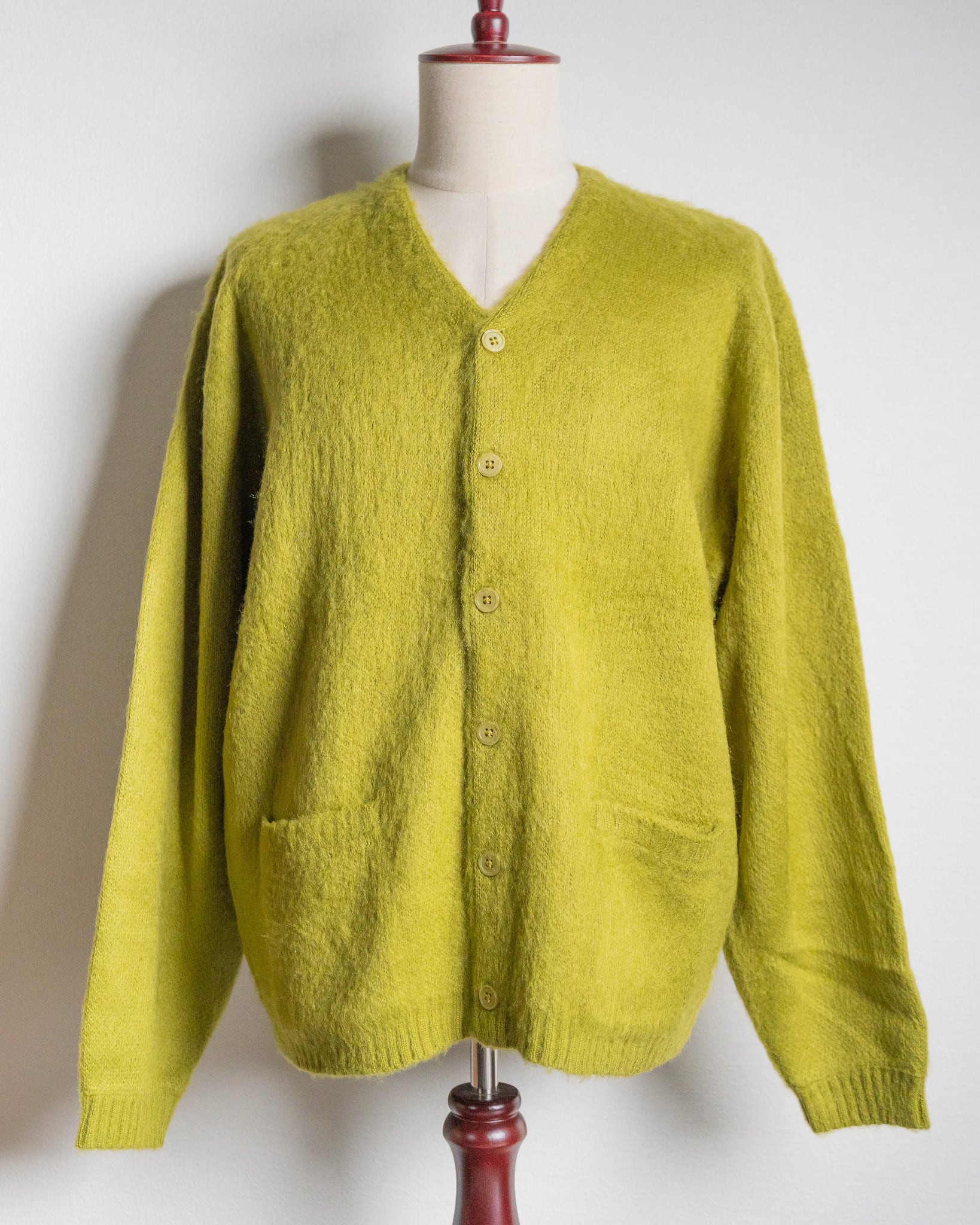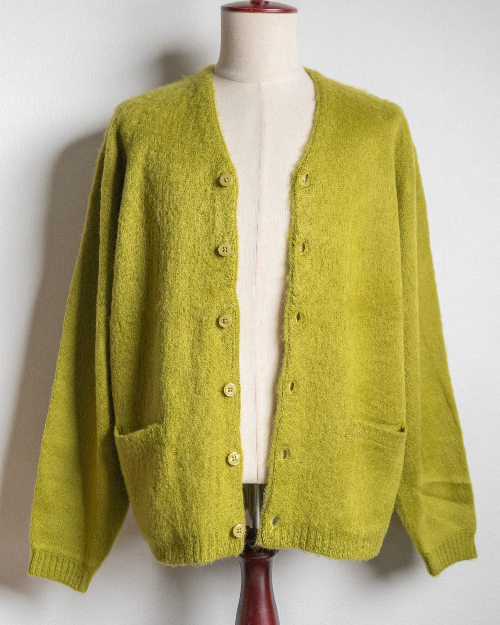 ヴィンテージのモヘアカーディガンが持つ特有の「毛足の長さ」や「クッタリとした落ち感」をモヘア調のアクリル糸で再現した1着。