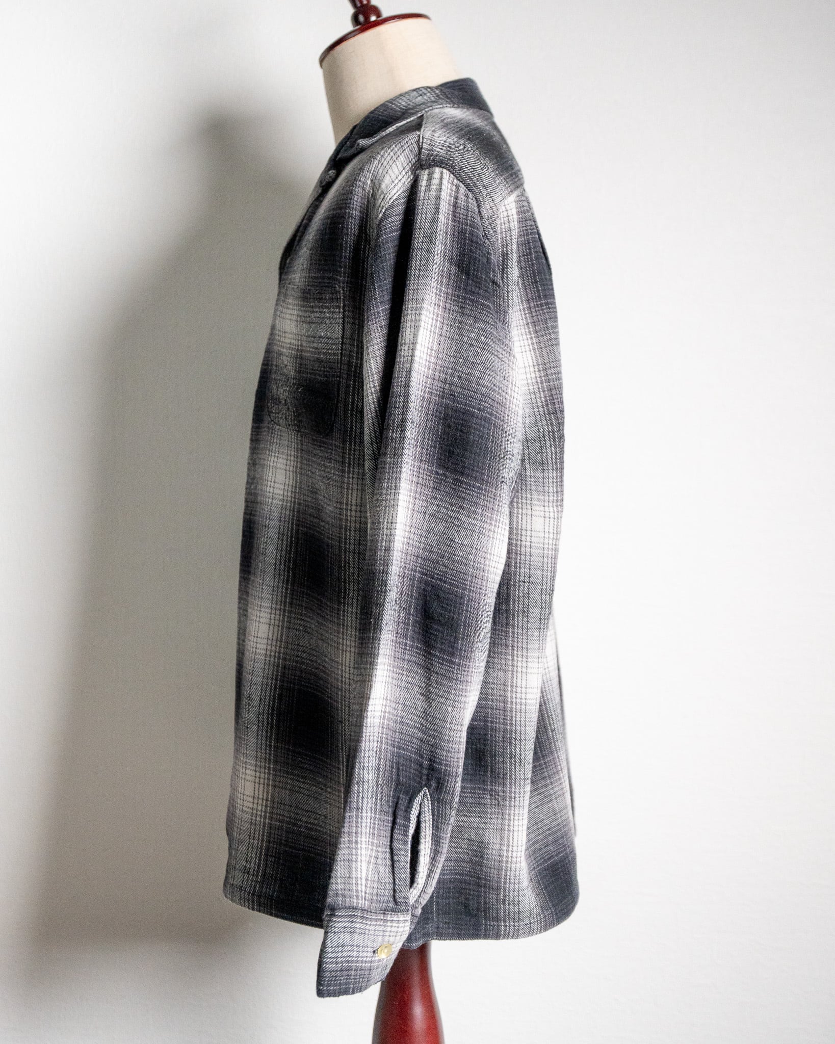 当時のXLサイズをベースに、袖丈・着丈・袖付の角度を丁寧に調整し、おさまりの良いボックスシルエットに仕上がっています。60年代の名作『LOOP COLLAR NEL OMBRE SHIRTS』と同様に、襟は控えめな開き具合、胸ポケットは丸みを帯びたポケットです。