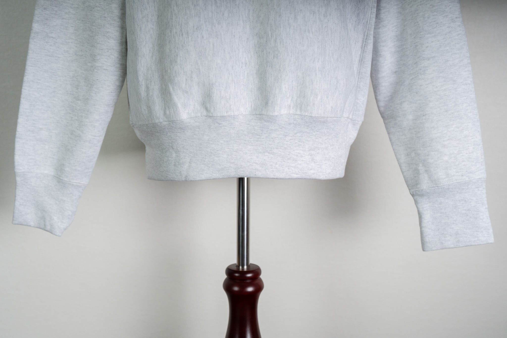 長めで強めに締まる袖と裾のリブ、着丈は短めでアームホールが太い、古き良きUSAスウェットを象徴するボックスシルエットです。