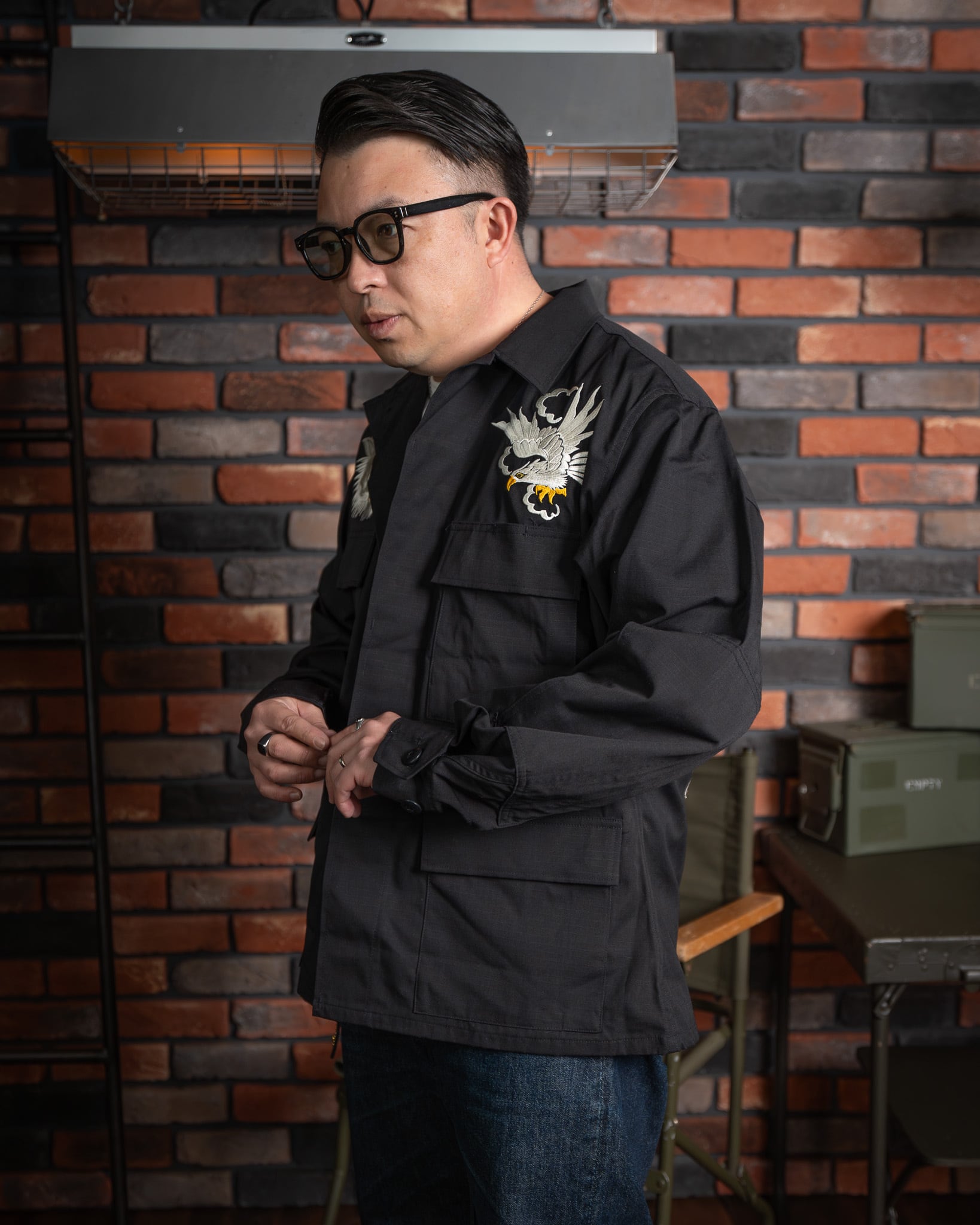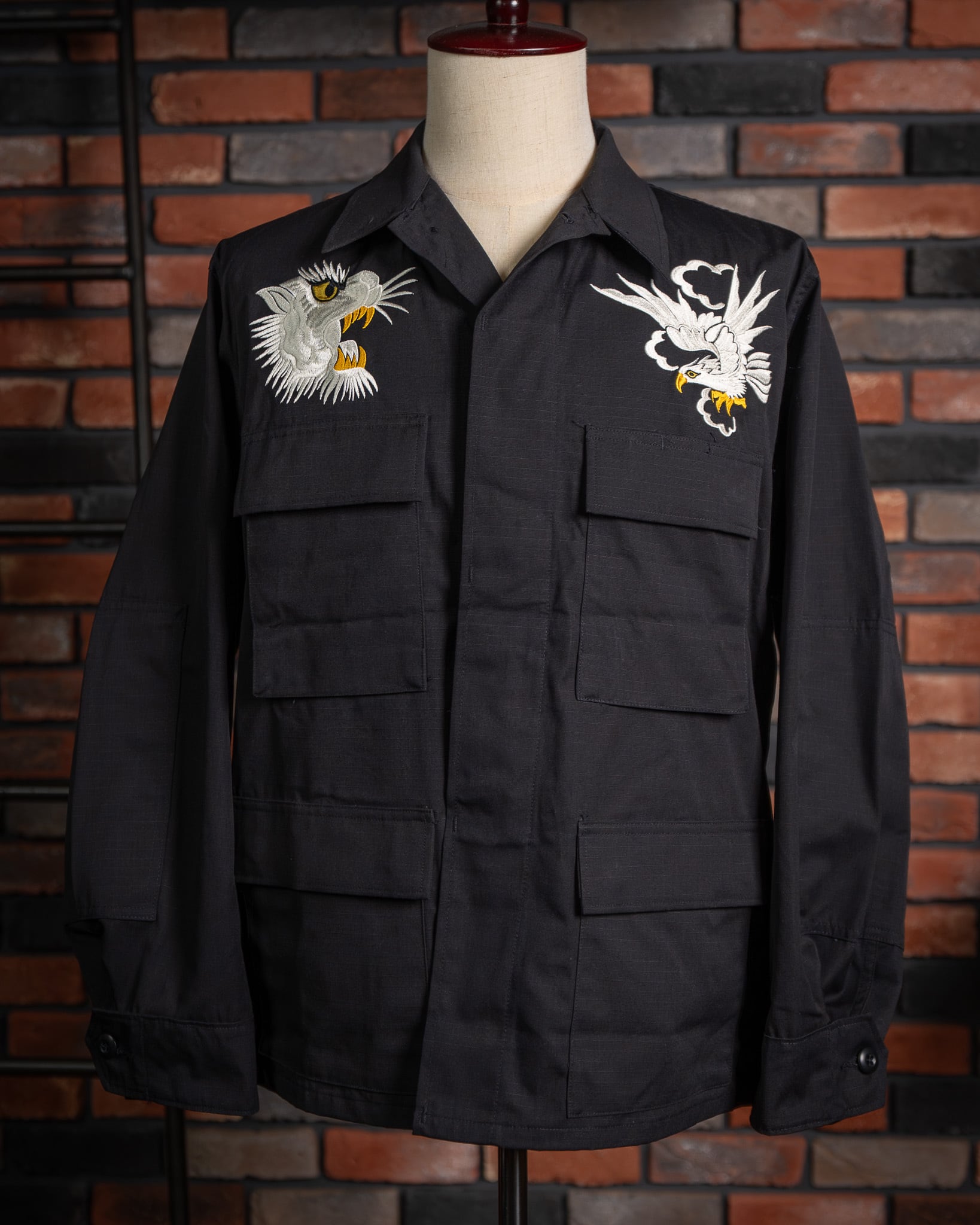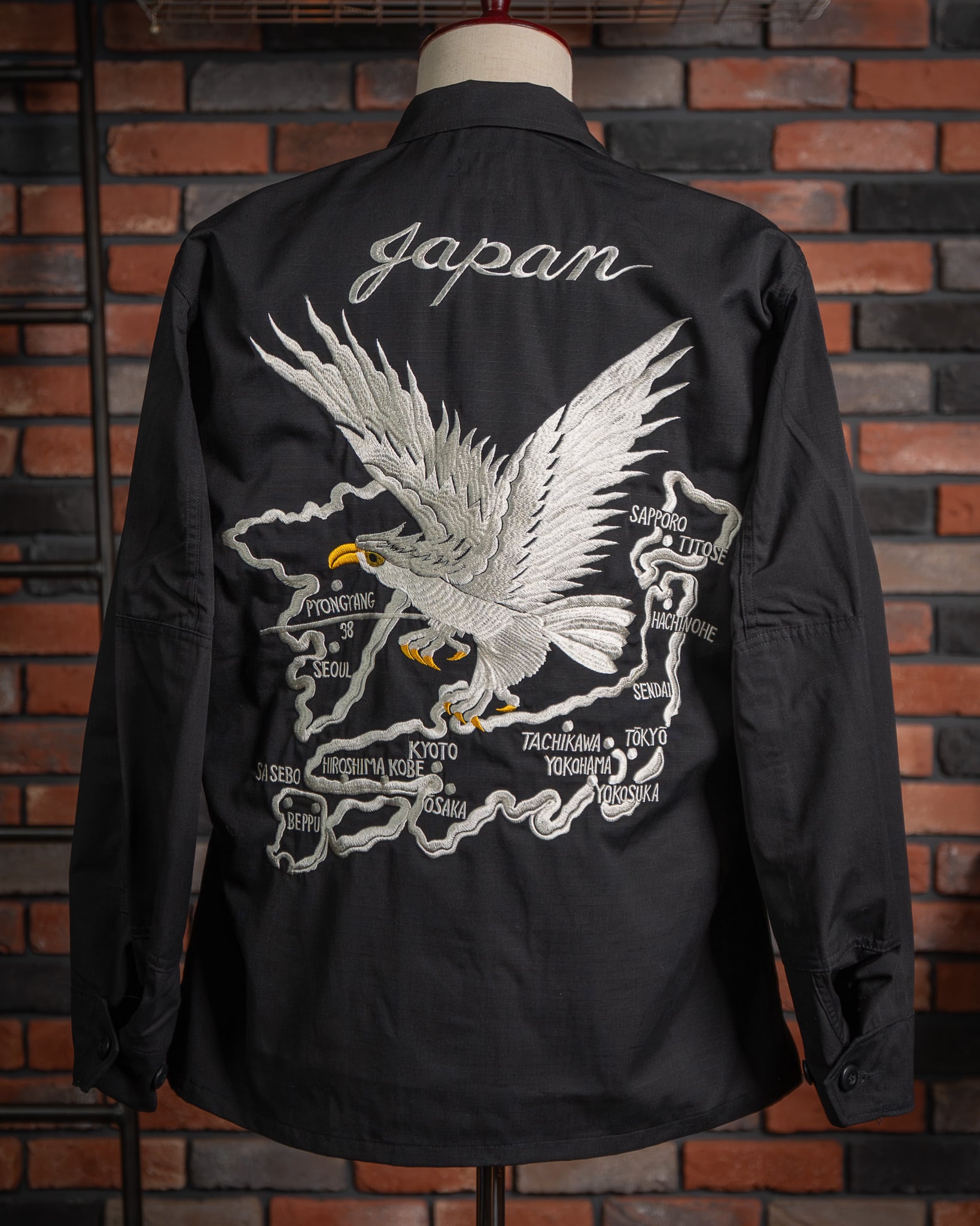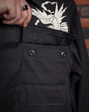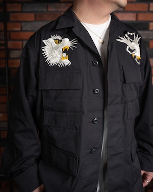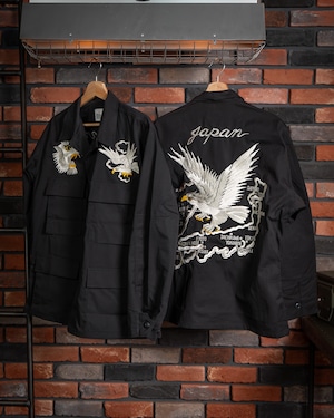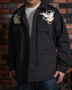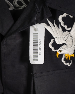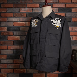 【HIRYU® Presented By A.R.P.® 】DEADSTOCK U.S.Army BDU Jacket Black357 Genuine Sukajan Embroidered "Japan Map × U.S. Bald Eagle" Size: Medium Short