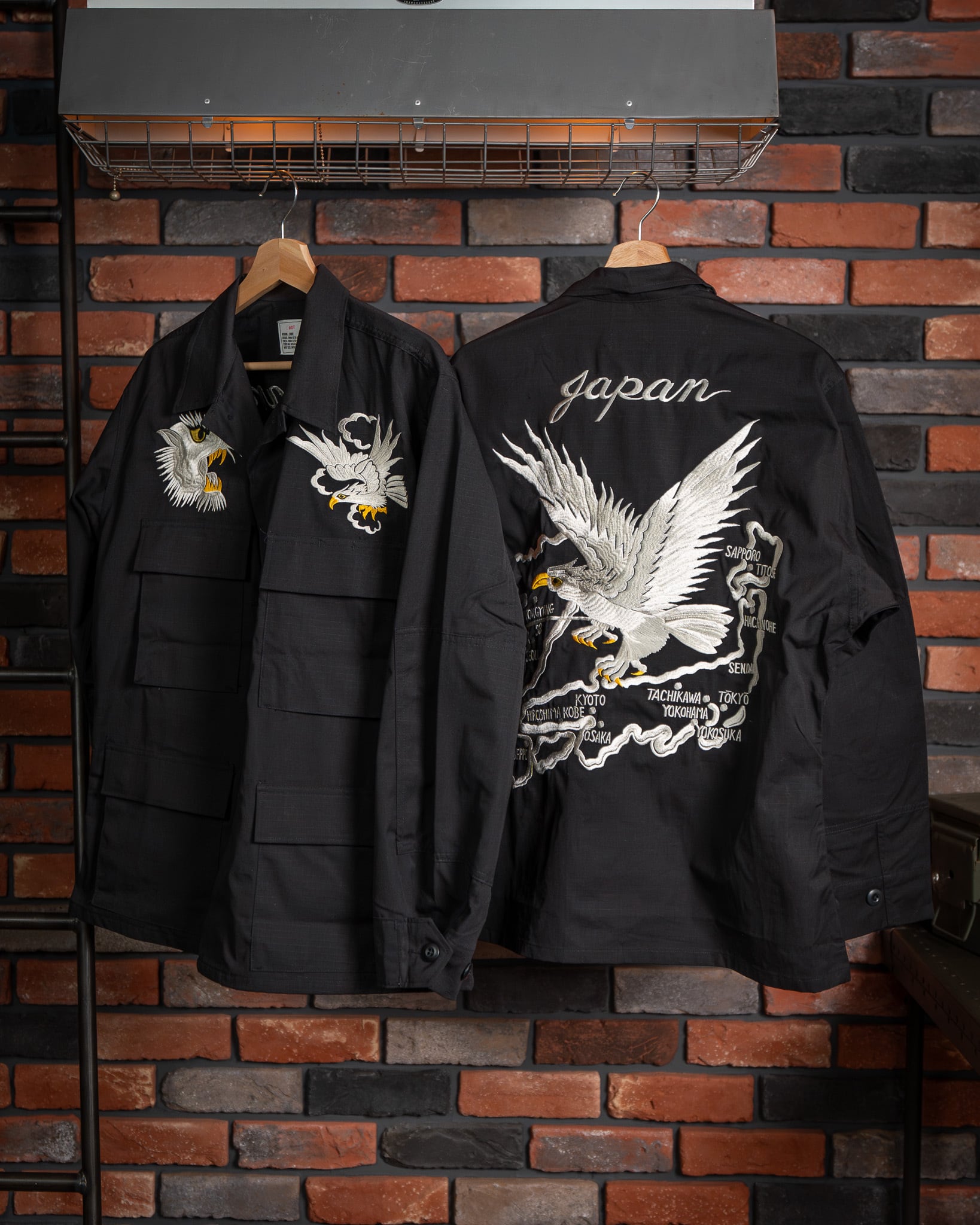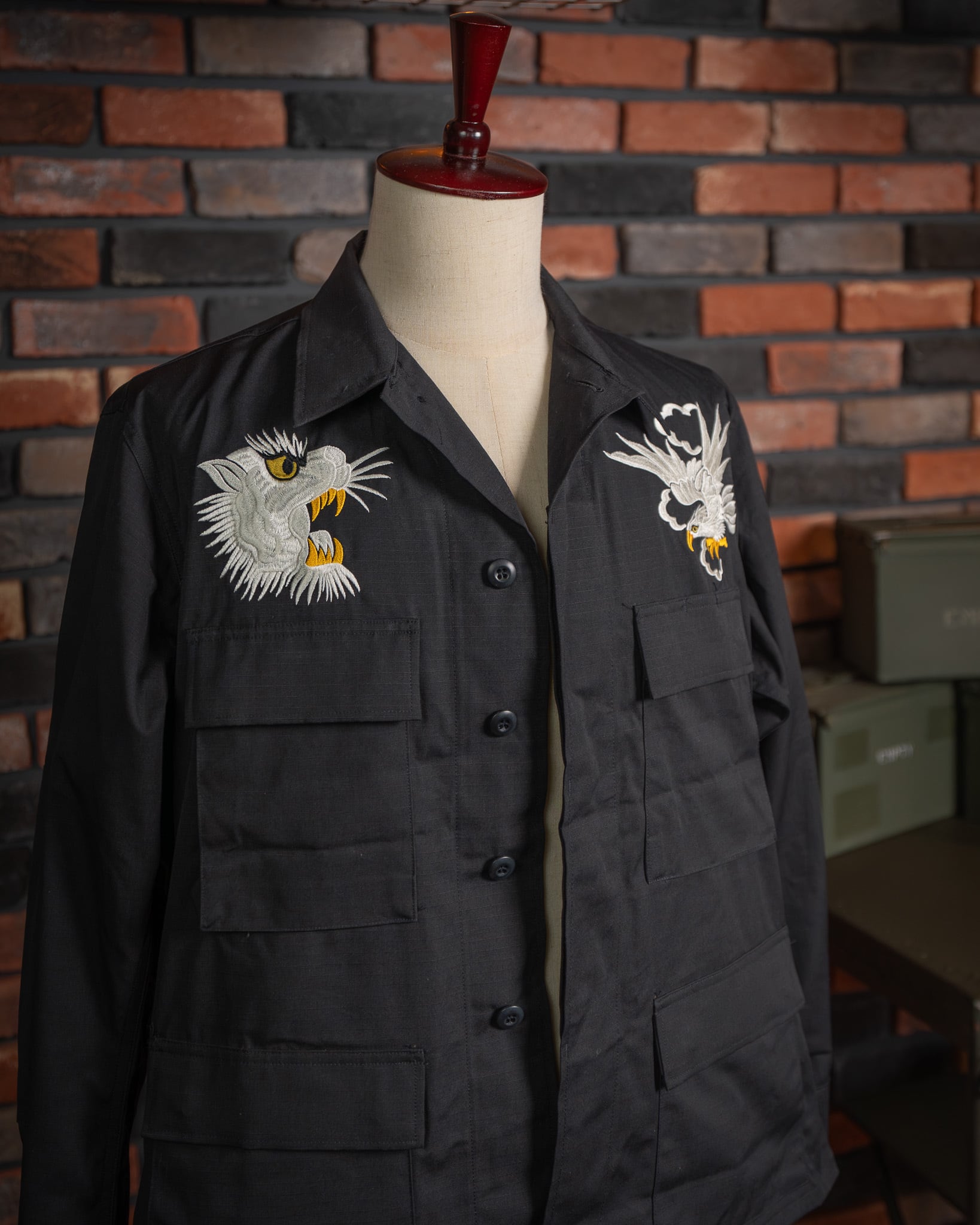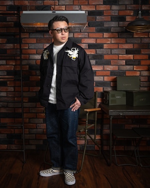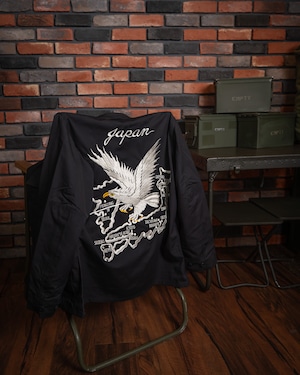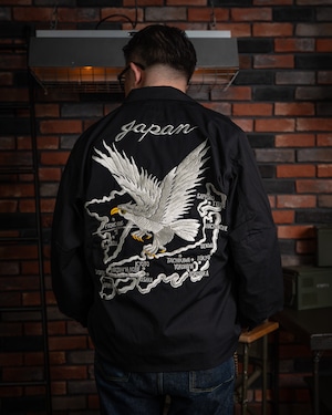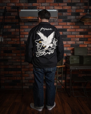戦後、日本に駐留した米軍兵士が、自身のジャケットに和の意匠を施したことから始まった「スカジャン」の歴史。刺繍の世界において、龍は韓国、虎は日本、そして鷲はアメリカを象徴すると云われます(諸説あり)。本作は、その「スーベニア(土産物)」という文化の根源を辿り、アメリカンスピリッツを日本古来の情緒へと落とし込んだ、クラシックかつベーシックな構図となっています。