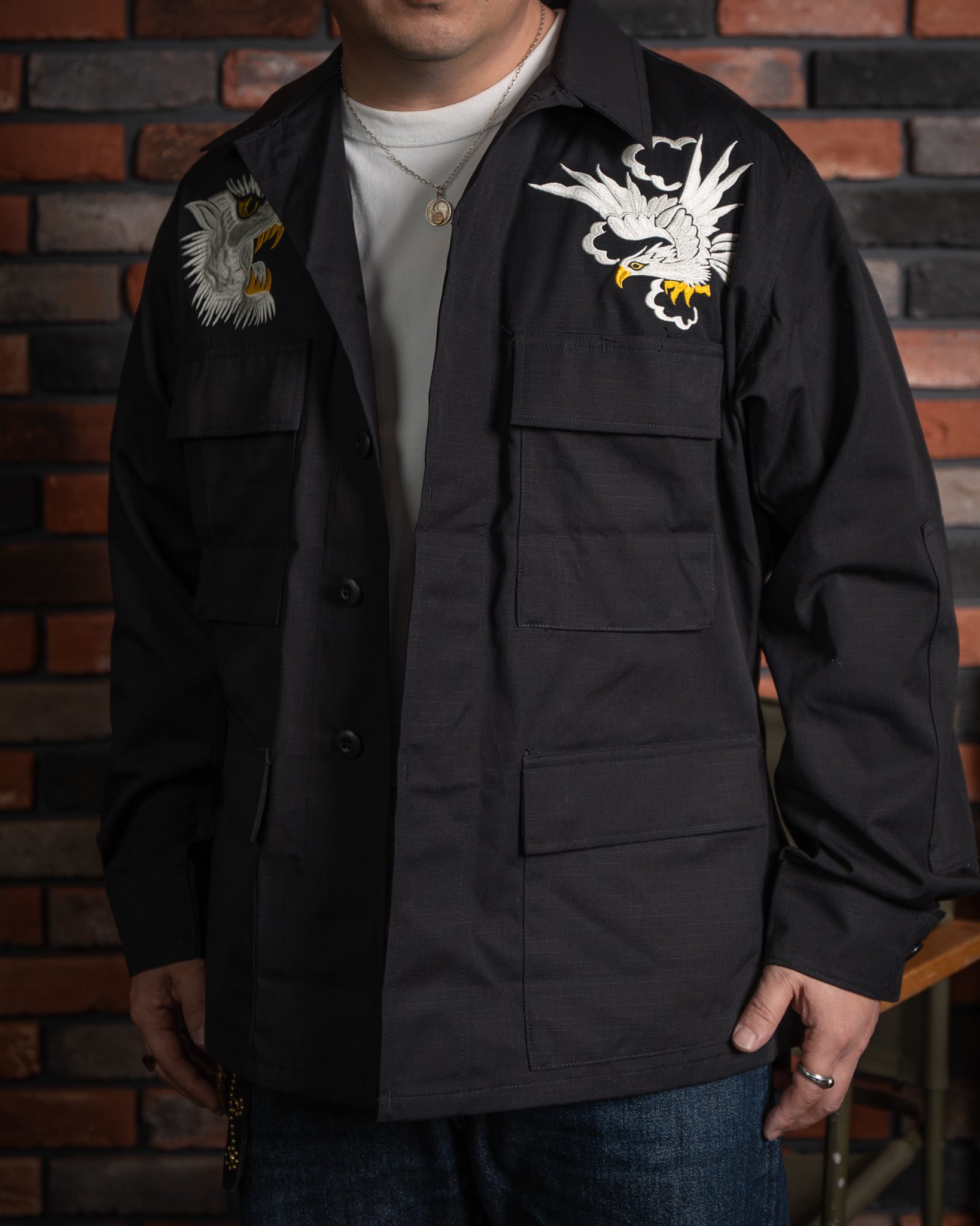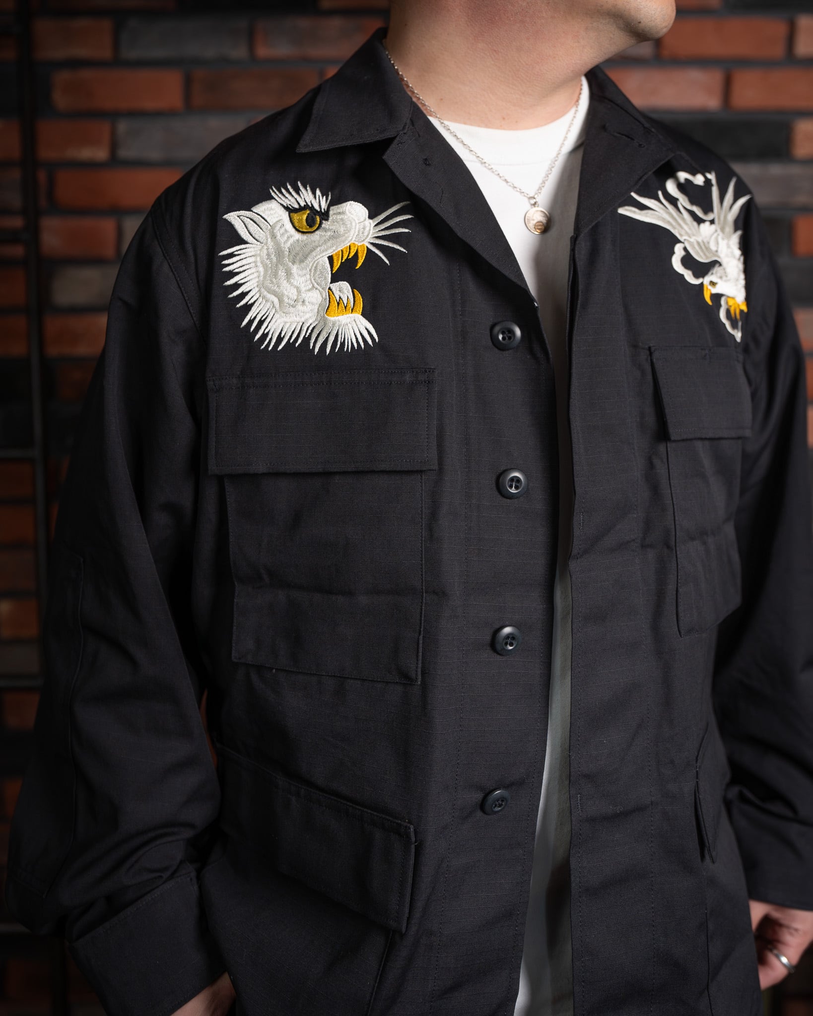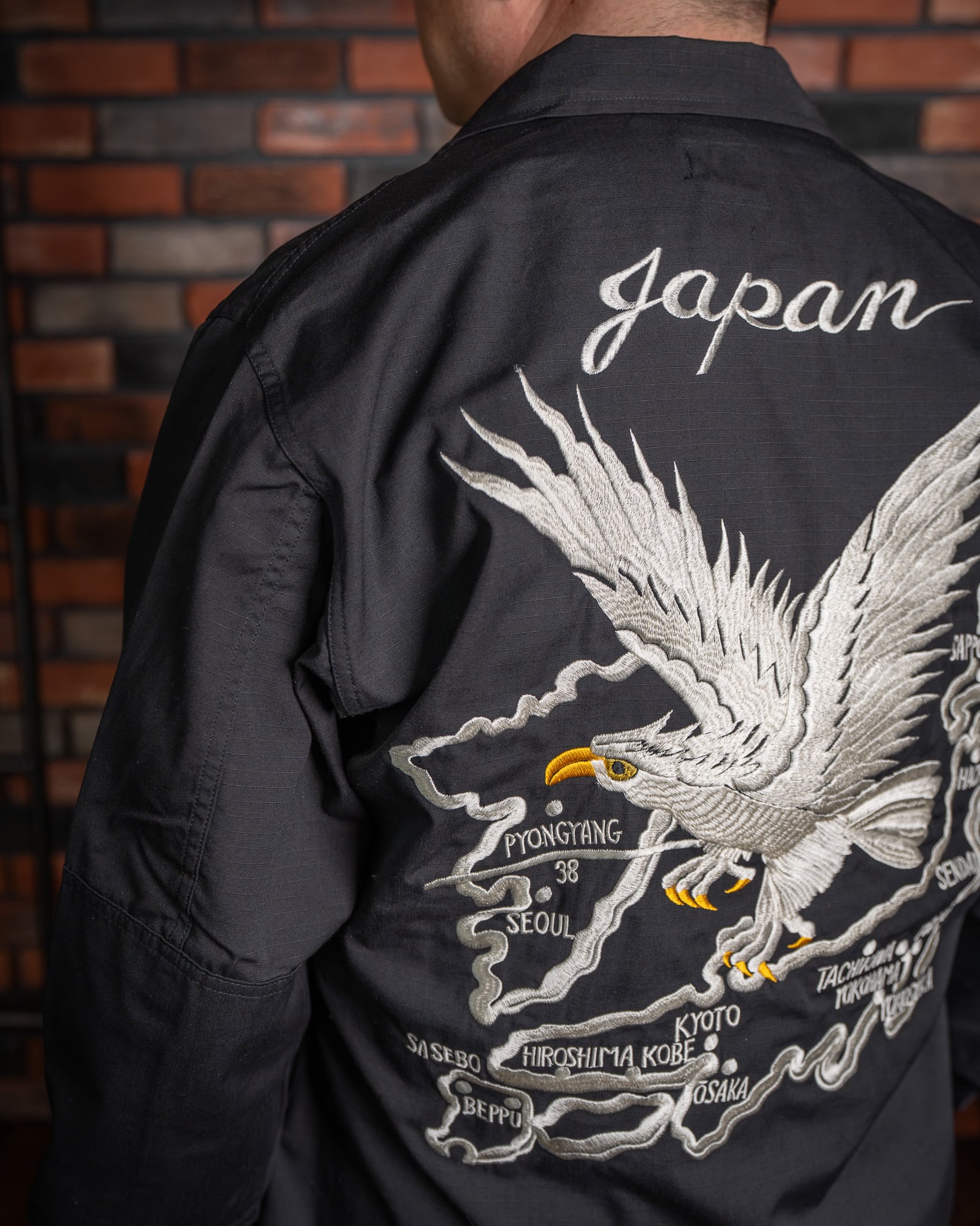 戦後、日本に駐留した米軍兵士が、自身のジャケットに和の意匠を施したことから始まった「スカジャン」の歴史。刺繍の世界において、龍は韓国、虎は日本、そして鷲はアメリカを象徴すると云われます(諸説あり)。本作は、その「スーベニア(土産物)」という文化の根源を辿り、アメリカンスピリッツを日本古来の情緒へと落とし込んだ、クラシックかつベーシックな構図となっています。