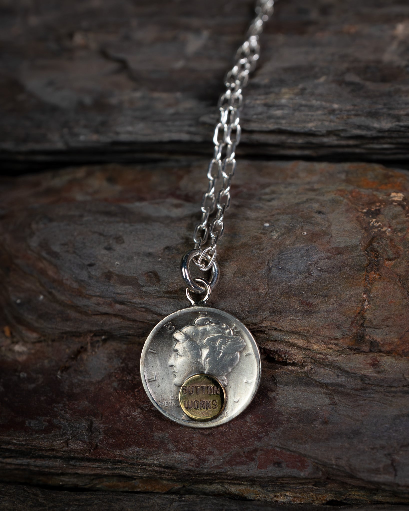 マーキュリーダイム銀貨は、アメリカの硬貨の中で最も美しいデザインといわれています。コインは燻し、磨き、BWオリジナルの真鍮プレート"Button Works"ロゴをロウ付けしています。