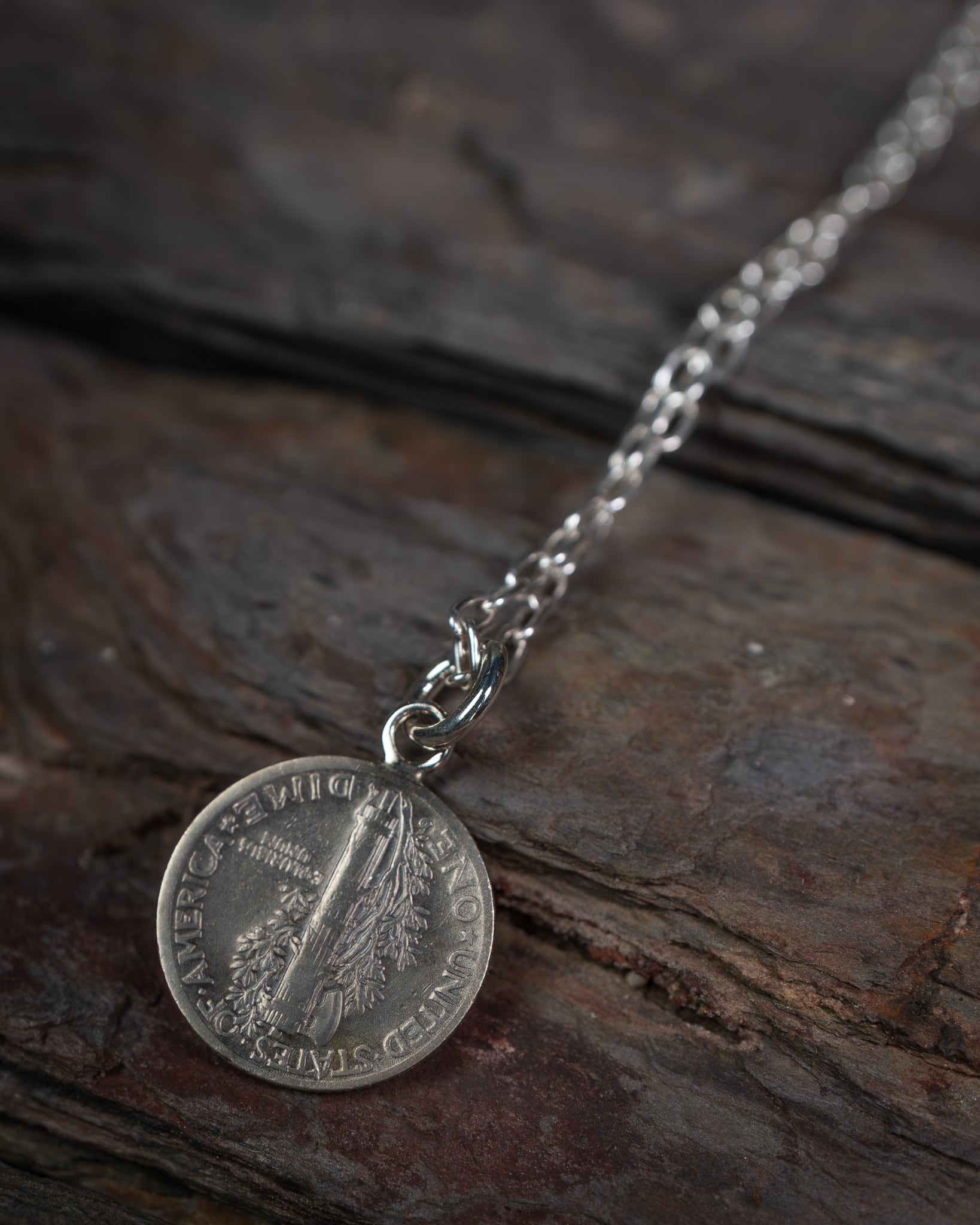 アメリカで1916から1945年まで製造されていた、銀の含有量が90%のVintageマーキュリーダイム銀貨を使用したコインネックレス。