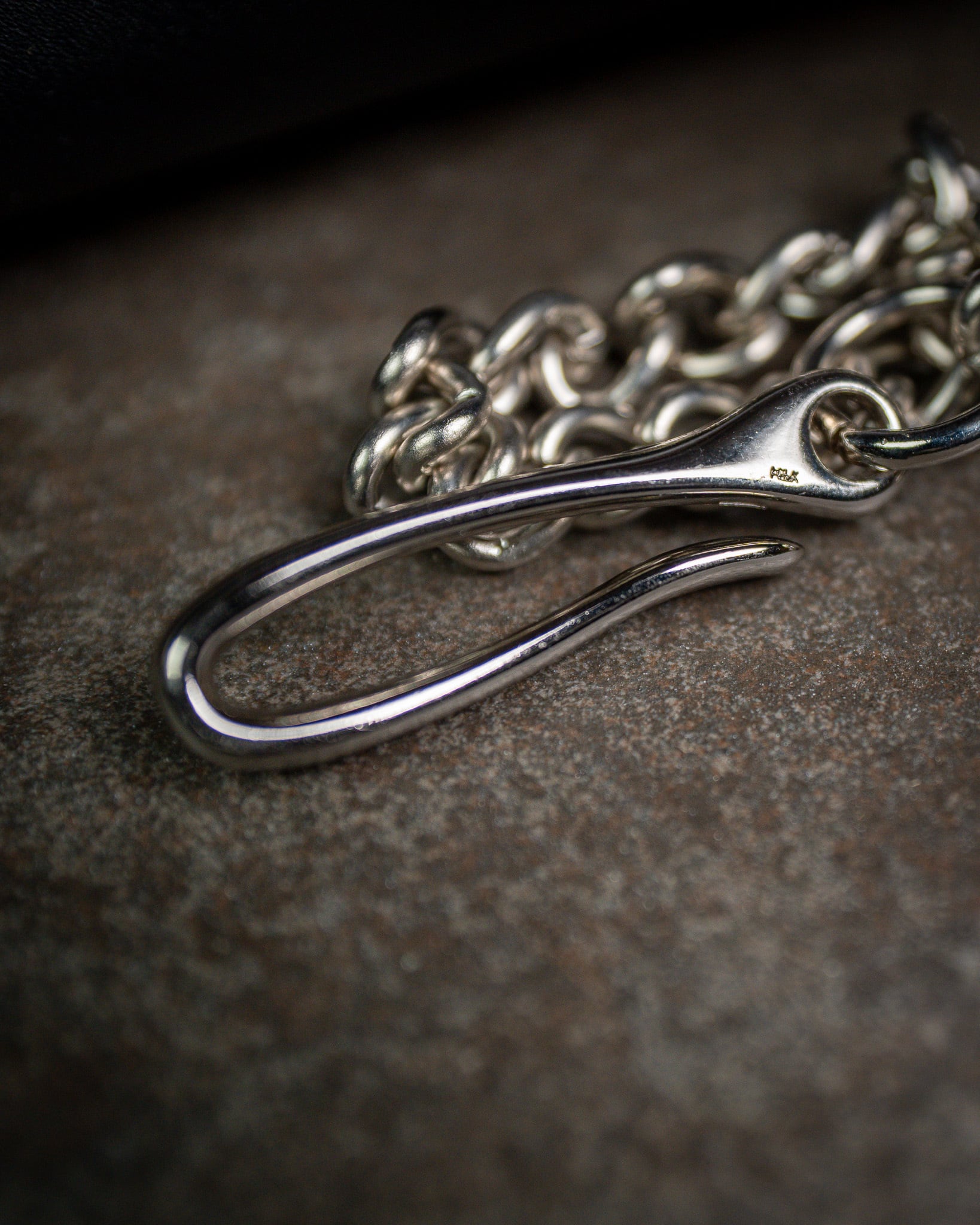 ベルトやベルトループにかけやすい、実用性に優れた「釣り針フック」と「レバーナスカン」を採用。コマにひねりを加えることで生まれた滑らかな質感が、重厚感とともに洗練された大人の印象を与えます。