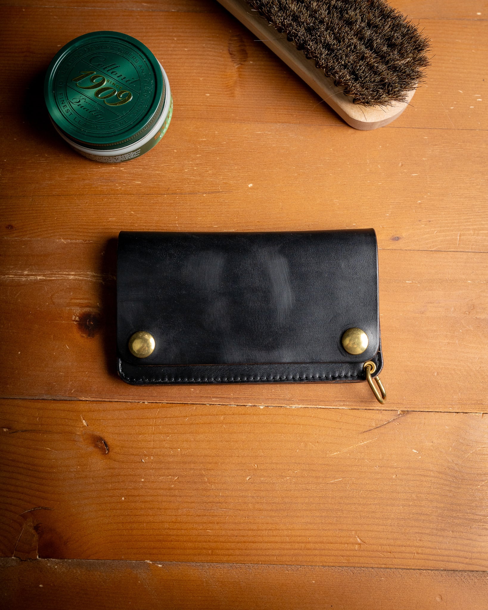 豊富なオイルを含んでいるため、過度な手入れは必要ありません。日常的なケアは、馬毛ブラシで優しくブラッシングしてホコリを落とすだけで、革内部のオイルによって、十分な美しさと艶を保つことができます。本革用クリームによる補給は、乾燥が気になり始めたタイミング(1年に1回程度)で十分です。
